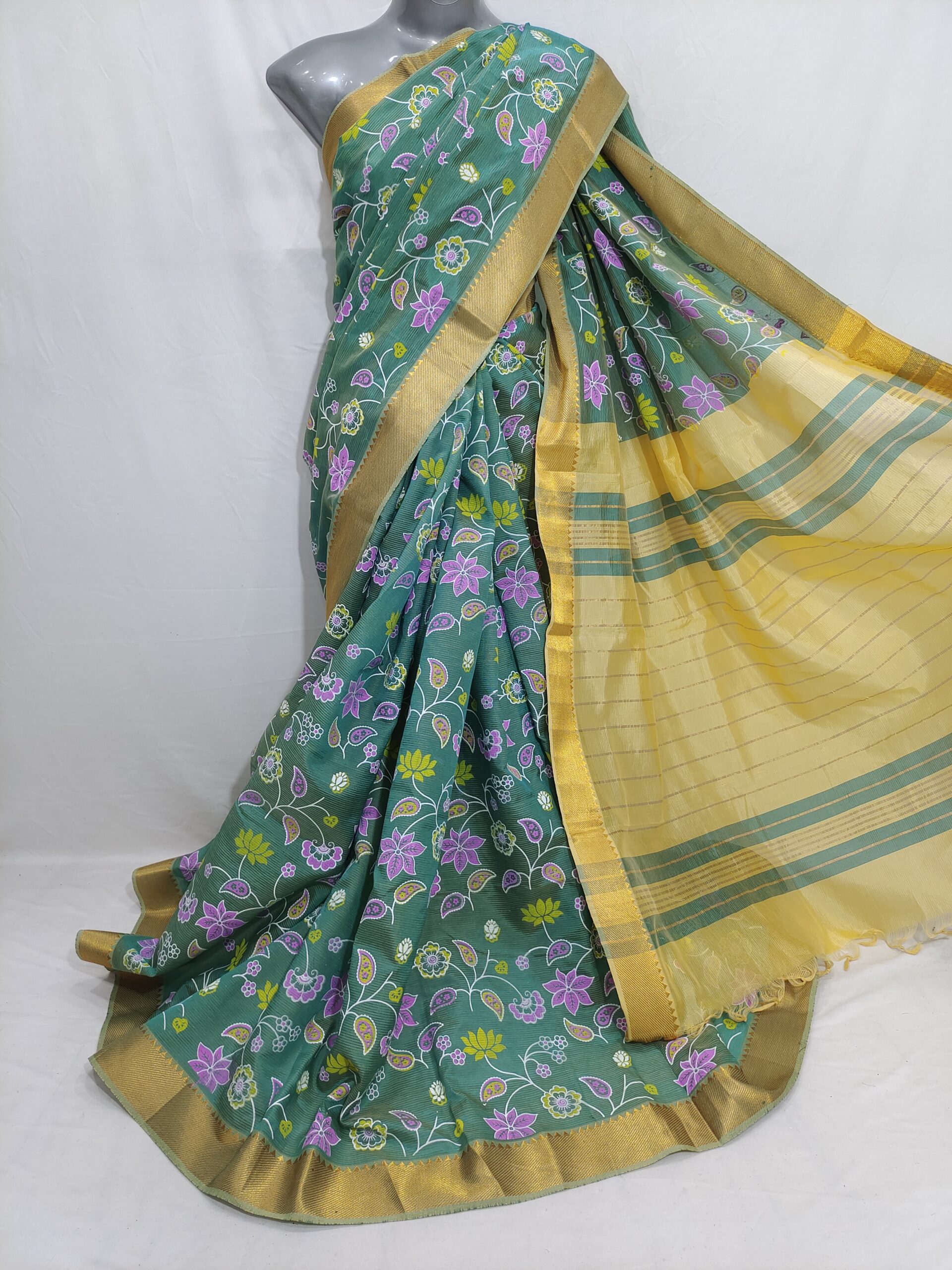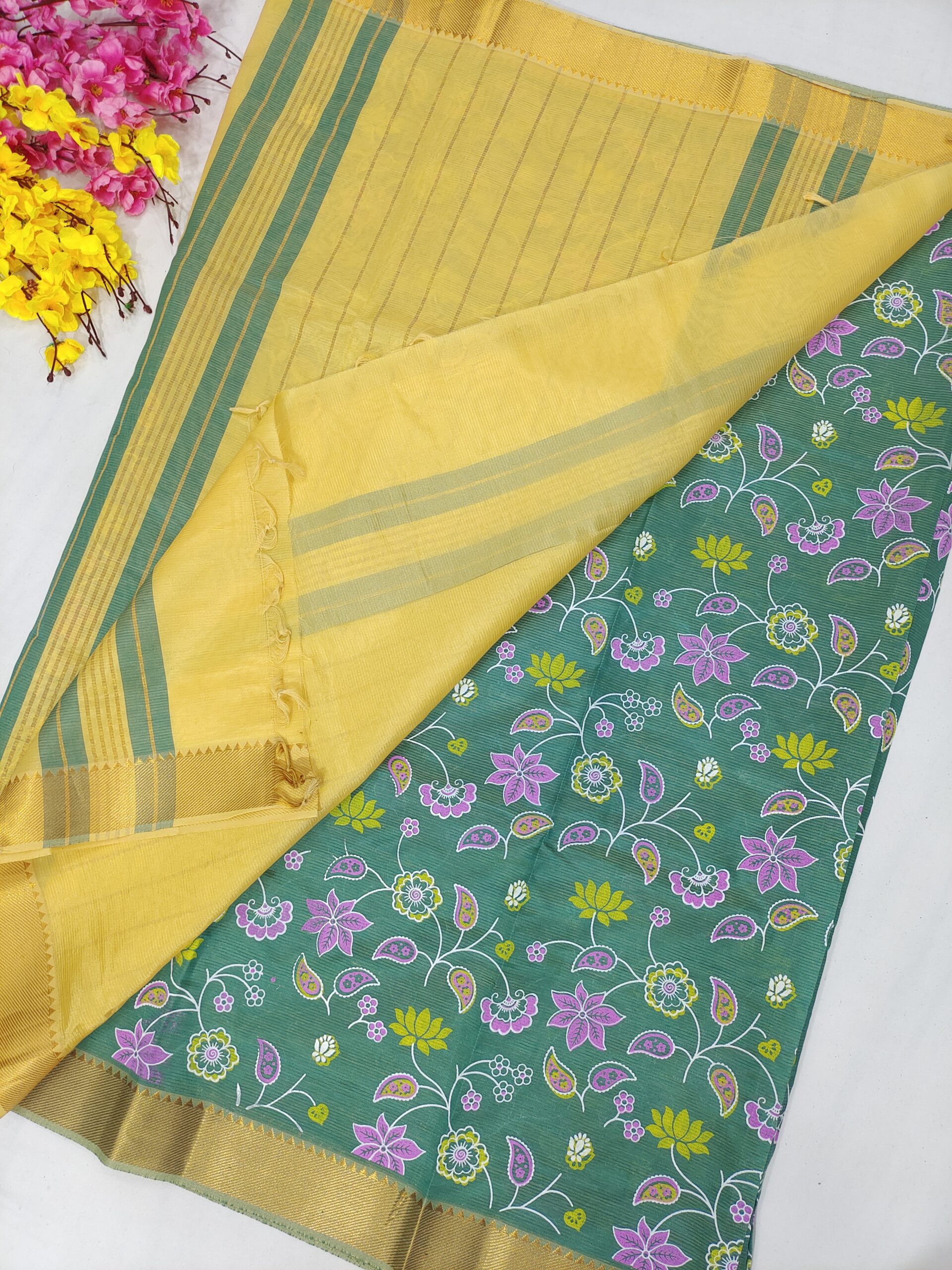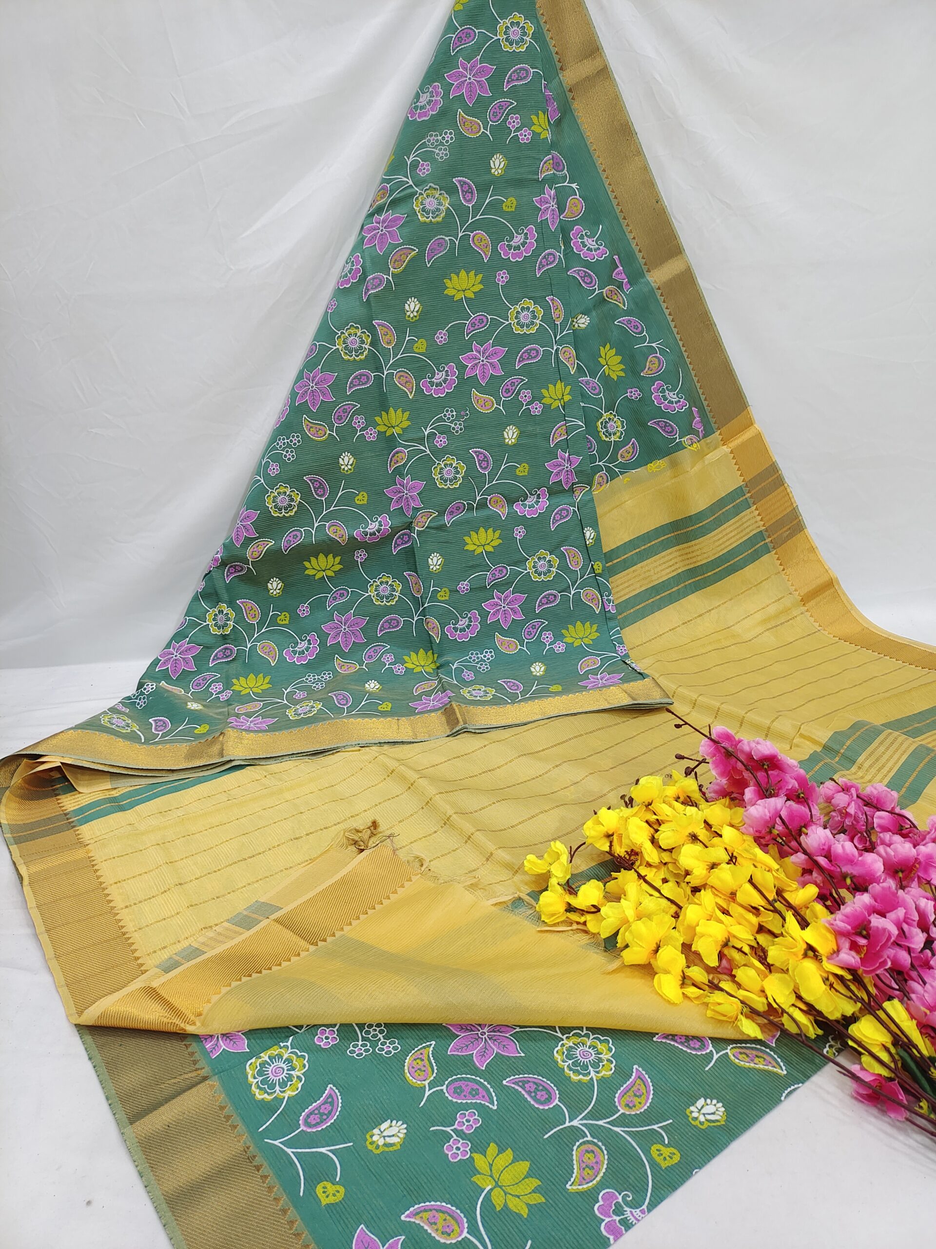 Blouse:Contrast Colour or Plain Blouse with Kanchi Border Body:Saree Body Beautiful Digital Printed Border:Kanchi Border One Side & Small Border Another Side Pallu:Contrast Colour Zari Lines Pallu.