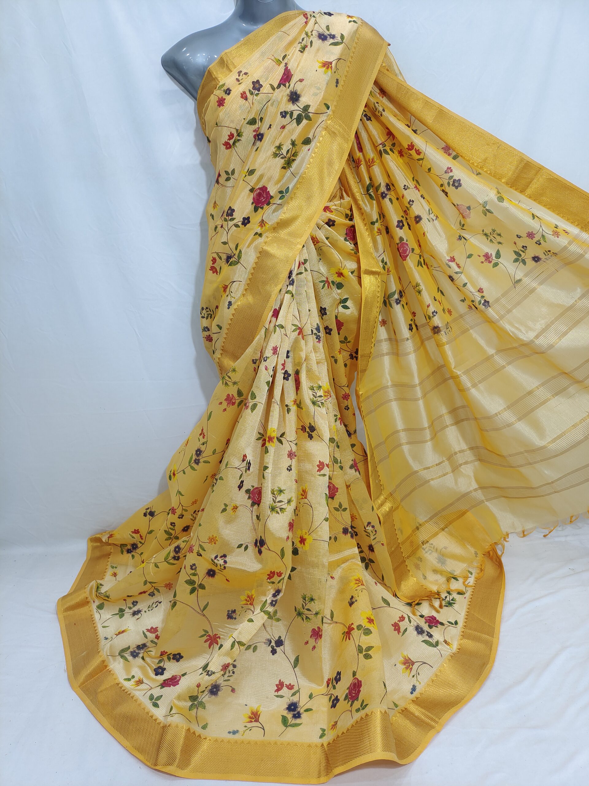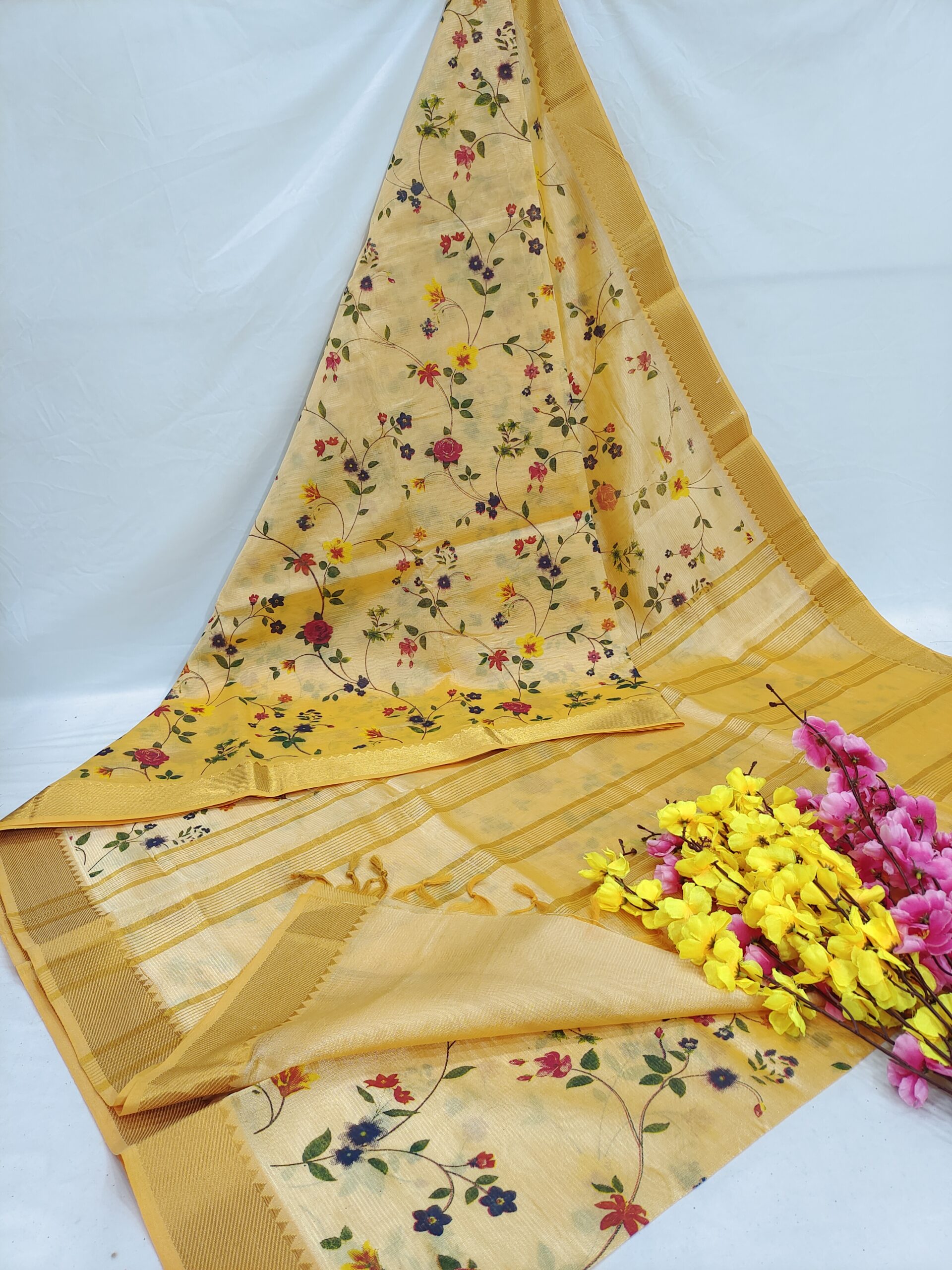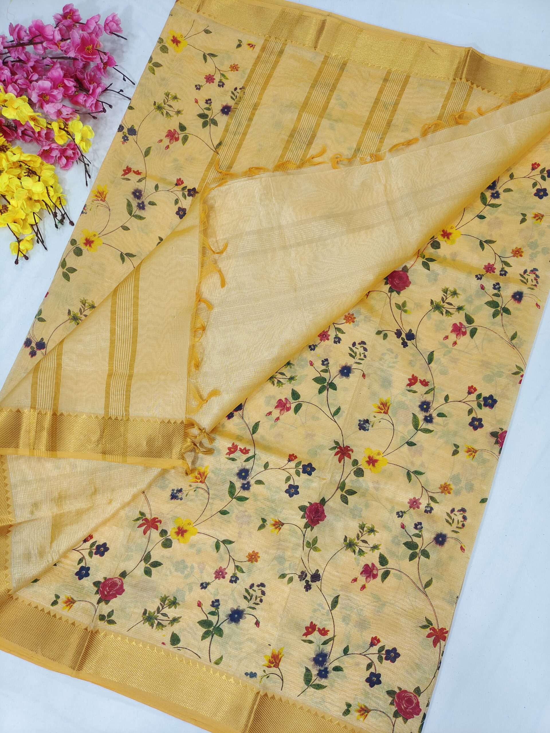 Blouse:Contrast Colour or Plain Blouse with Kanchi Border Body:Saree Body Beautiful Digital Printed Border:Kanchi Border One Side & Small Border Another Side Pallu:Contrast Colour Zari Lines Pallu.