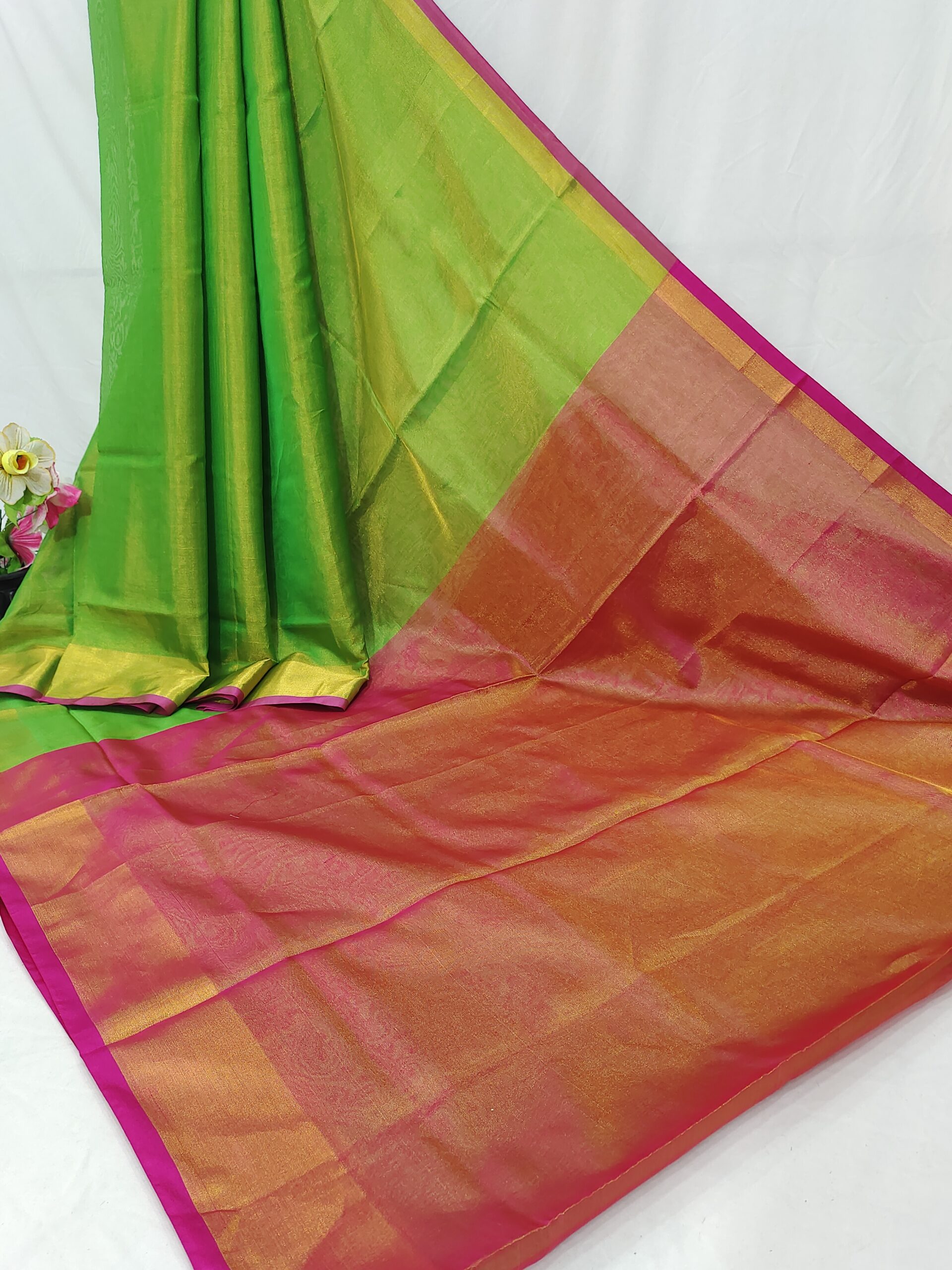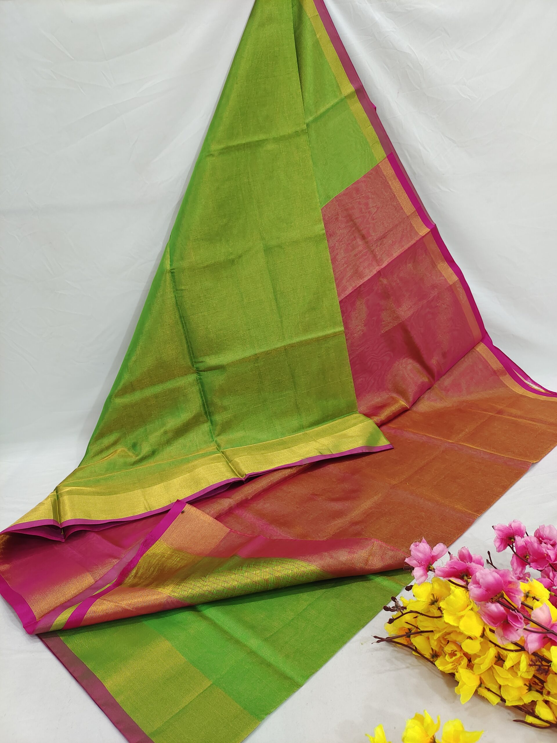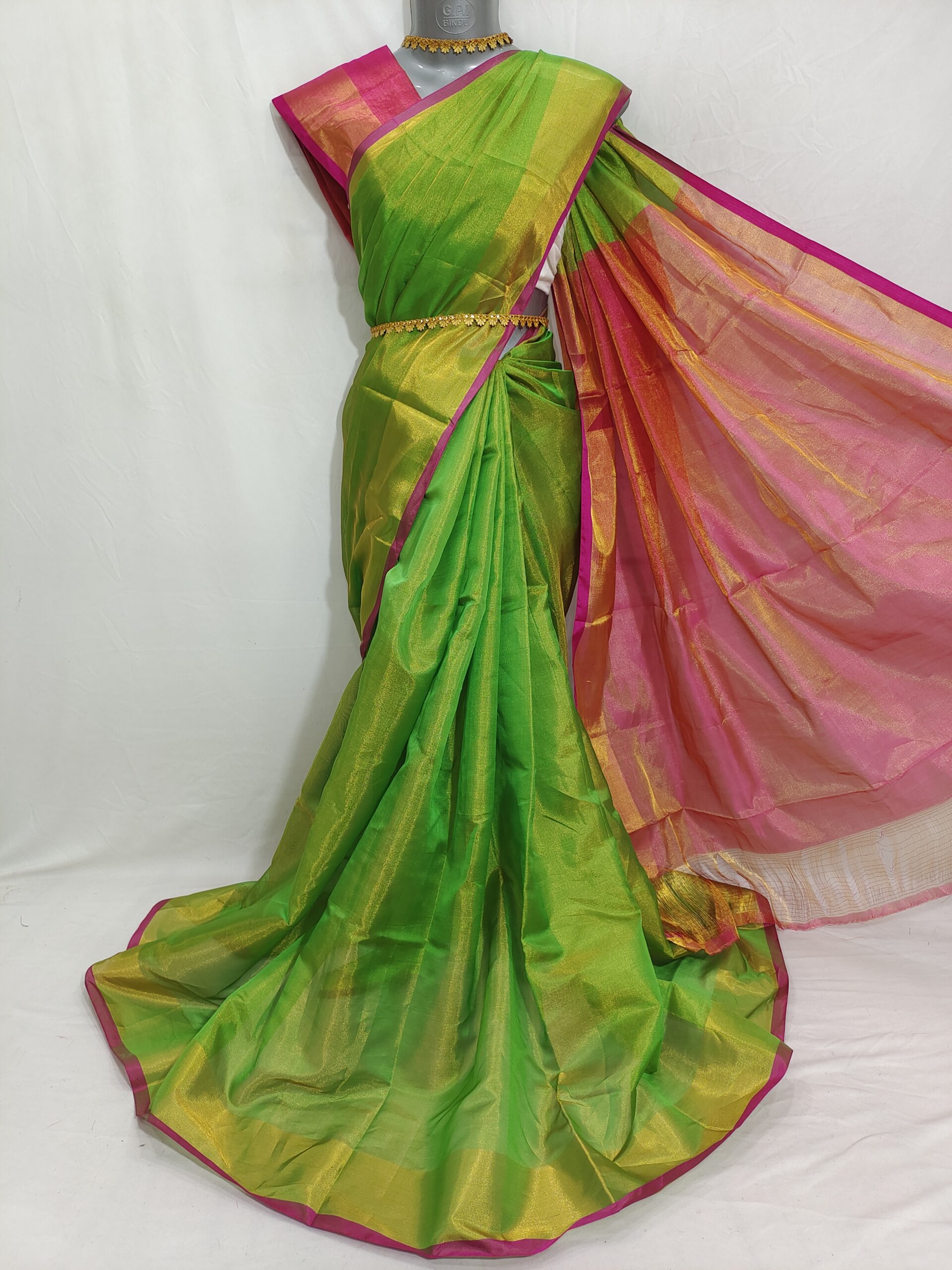 Blouse:Contrast Colour Plain Blouse Body:Saree Body High Quality Zari Warp Tissue Border:Beautiful Gold Zari Border Pallu:Contrast Colour Zari Lines Pallu. Wholesale price: 1800